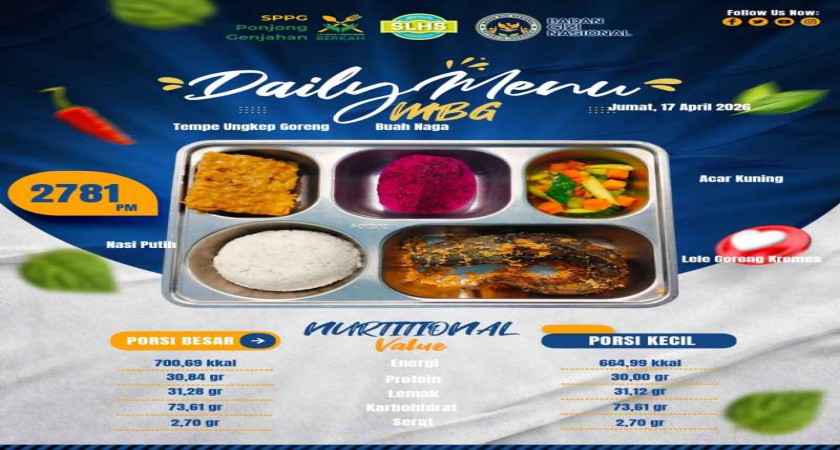 Ponjong (MIN 11 Gunungkidul) — Program Makan Bergizi Gratis (MBG) di MIN 11 Gunungkidul kembali menghadirkan menu sehat dan bergizi bagi para siswa pada Jumat, (17/04/2026). Menu yang disajikan kali ini terdiri dari nasi putih, tempe ungkep goreng, lele goreng, acar kuning, serta buah naga sebagai pelengkap nutrisi.